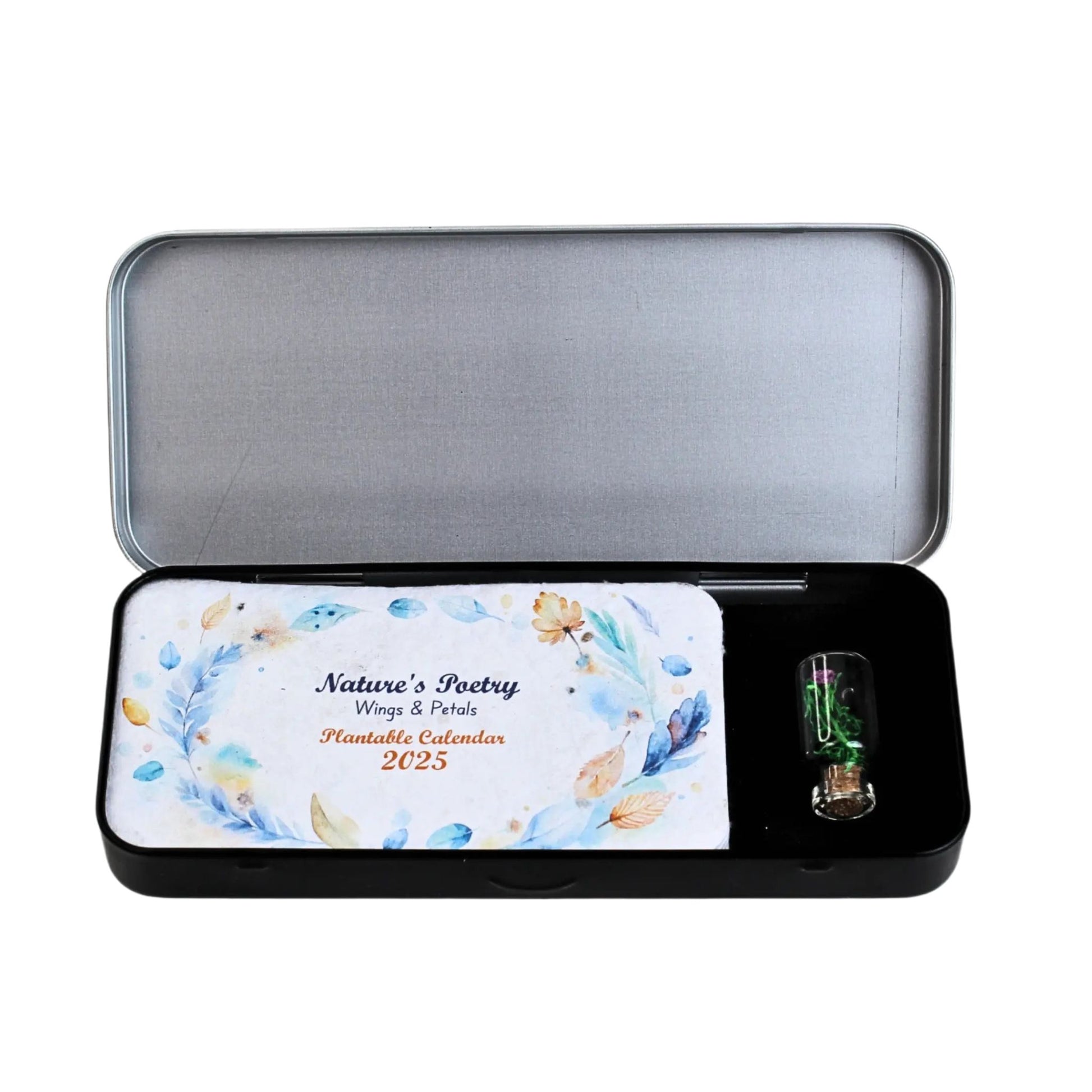 The Box Forest Calendar features 12 plantable seed-paper sheets measuring 7″×3″, each designed to grow a mini forest when planted. Packaged in a durable metal tin with a glass vial, this set combines sustainability with expert craftsmanship, offering an innovative way to engage with nature throughout the year. Ideal for eco-conscious users, it promotes environmental awareness and adds a living element to your calendar experience.