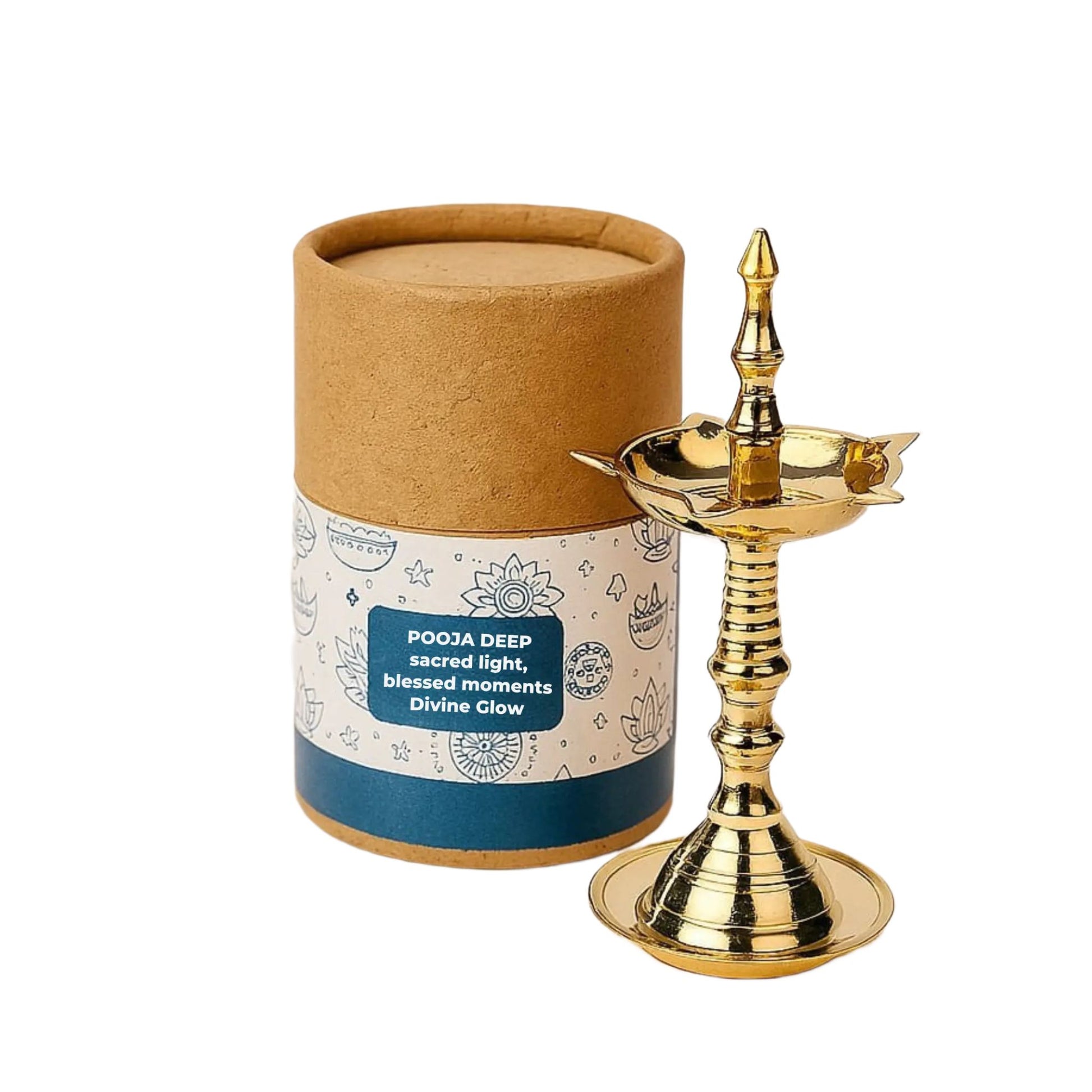 This Brass Pooja Deep, measuring 3" in height and 2" in diameter, features a traditional design crafted from pure brass for authentic spiritual use. Its superior heat retention ensures a steady and lasting flame during rituals. Packaged in an eco-friendly tube, it combines time-honored craftsmanship with environmental responsibility, making it an ideal addition to your sacred ceremonies.