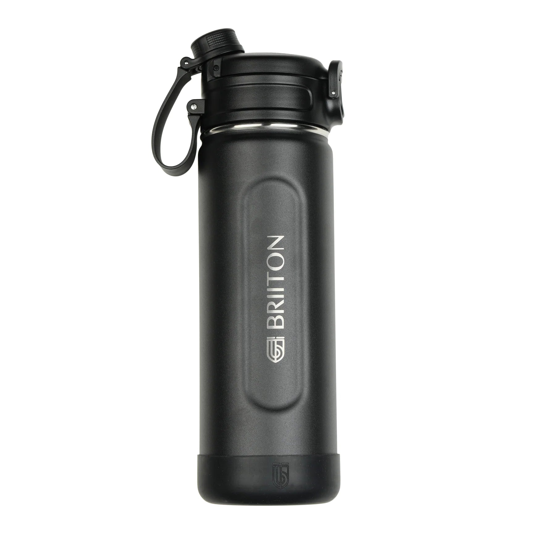 The Briiton Universo S 1000ml vacuum bottle features a leak-proof design with a dual cap system, including an easy-pour lid and a convenient sip lid for versatile use. Its powder-coated surface ensures long-lasting color durability, combining functionality with a sleek finish ideal for daily hydration needs.