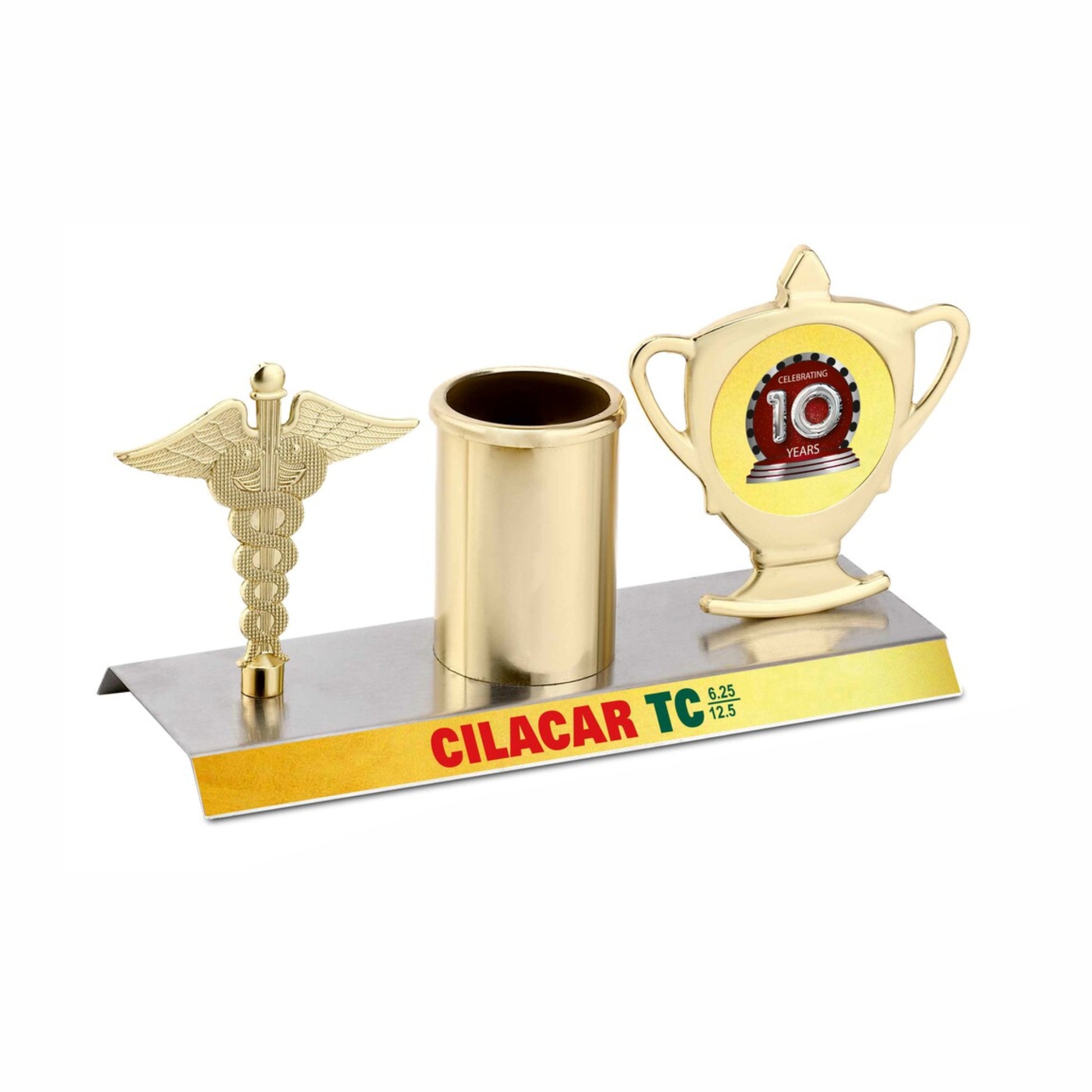 This distinguished desk accessory merges professional symbolism with practical elegance. Featuring the caduceus emblem alongside a gleaming trophy design, it serves as a powerful recognition piece for healthcare milestones and years of service. The integrated pen holder adds functional value to your workspace, while the metallic branding strip accommodates multi-colour personalisation for customised messaging. Crafted to inspire and commemorate, this piece elevates any professional environment with its sophisticated design and meaningful purpose.