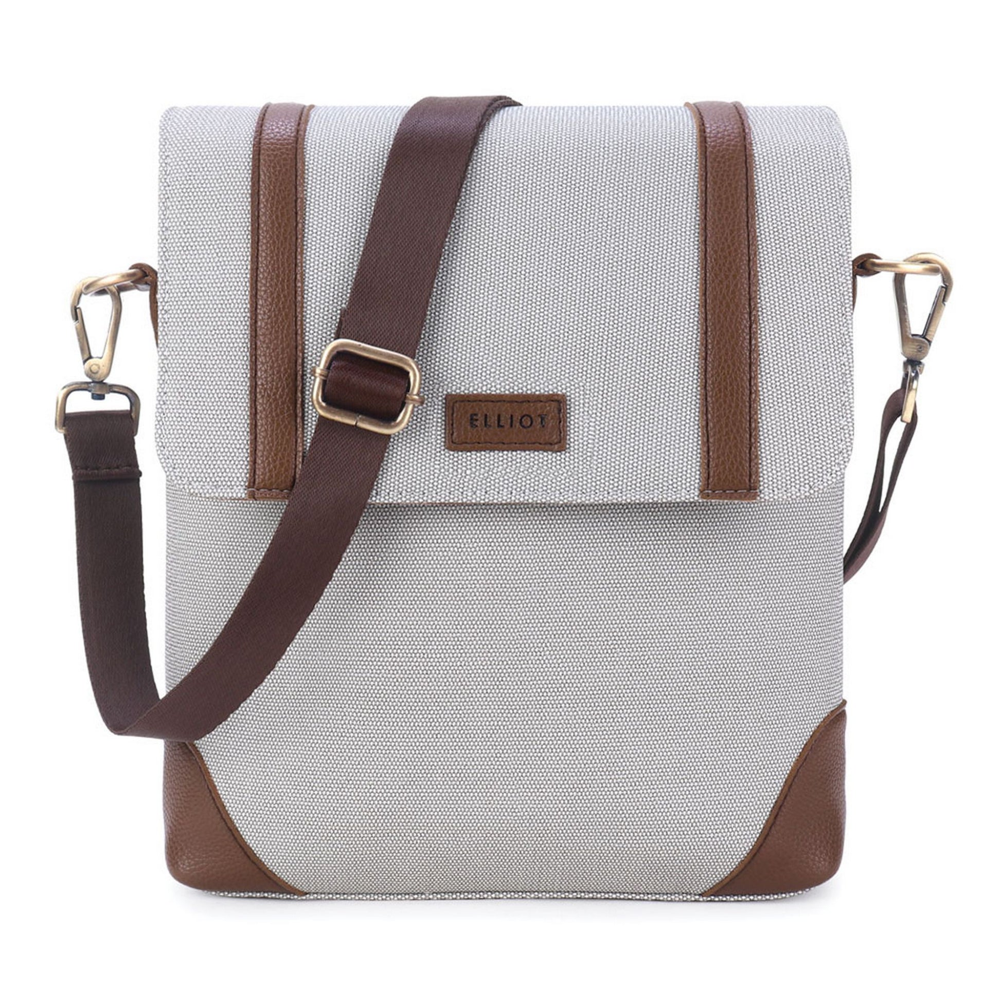 The Elliot Oxford Series Grey Messenger Bag merges contemporary design with practical functionality for professionals and creatives on the move. Its light grey textured fabric paired with contrasting brown faux leather accents creates a refined, versatile aesthetic that complements any wardrobe. Built for daily demands, this messenger bag features a secure main zip compartment alongside a magnetic flap closure for reliable access to documents, tablets, and personal items. The thoughtfully designed interior includes a dedicated tablet sleeve, inner zip pocket, and accessory compartment, while an external rear zip pocket ensures quick retrieval of frequently needed items. Clean lines and tactile materials deliver both visual sophistication and durability, making this bag an essential companion for work, study, or creative pursuits.