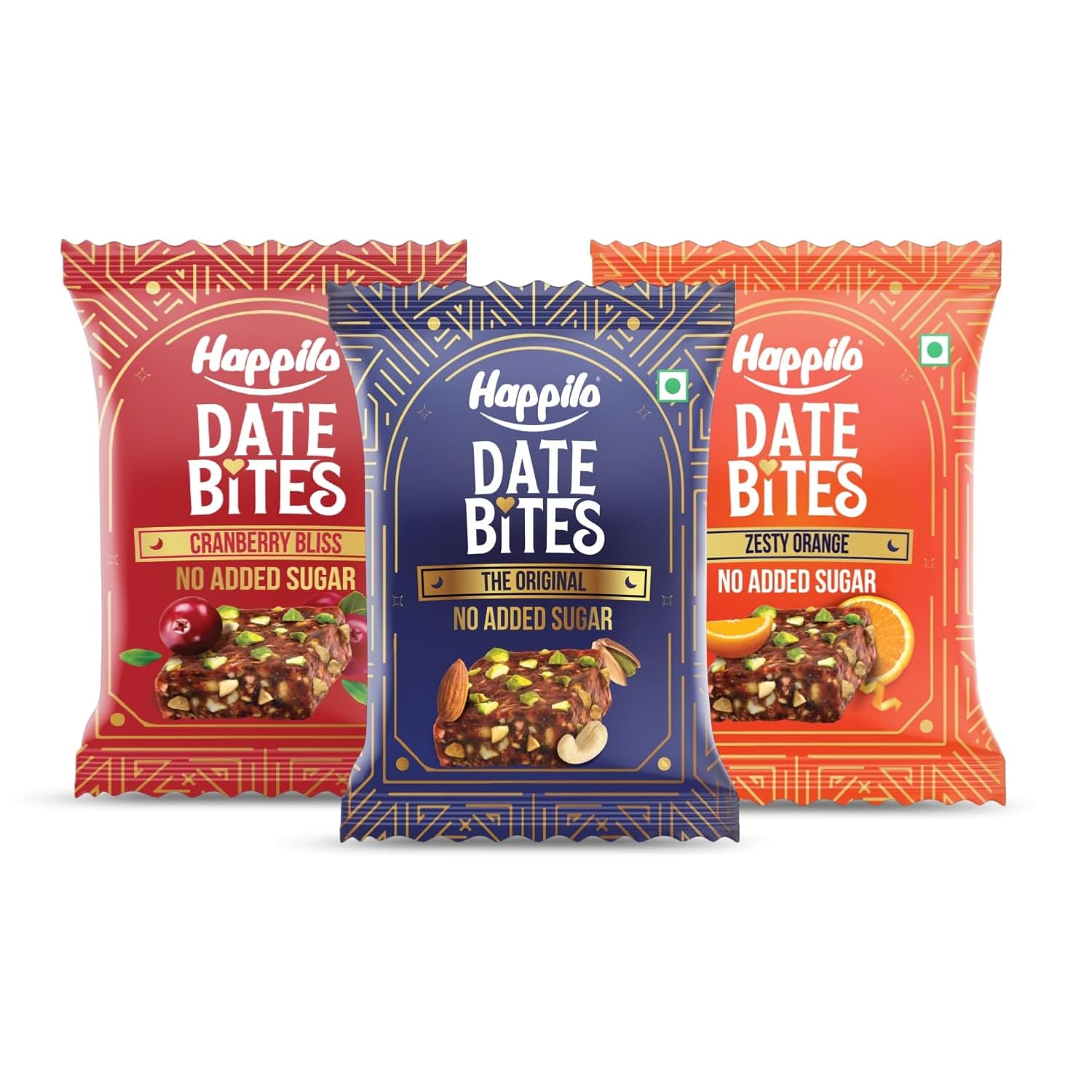 Happilo Date Bites Gift Pack offers a curated trio of 20g packs featuring Original Date Delight, tangy Cranberry, and refreshing Zesty Orange. Crafted from premium dates, dry fruits, and natural ingredients, each individually wrapped pack ensures freshness and convenience. Perfect for gifting, travel, or a nutritious snack, these bites deliver natural sweetness combined with diverse flavors. Ideal for on-the-go consumption, enjoy them directly from the pack and store them in a cool, dry place to maintain quality. This pack provides a balanced, healthy snacking option with a sophisticated taste profile.