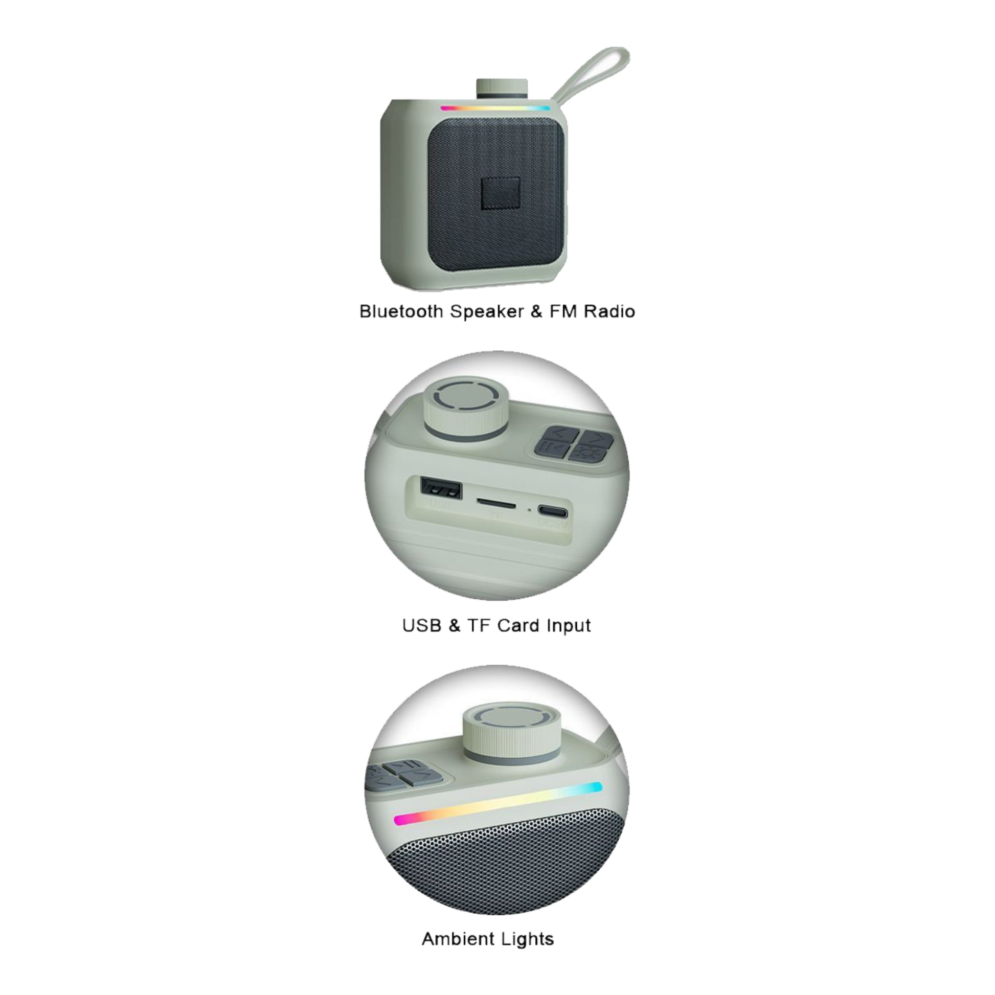 Supports: Wireless, FM Radio, USB, TF Cards