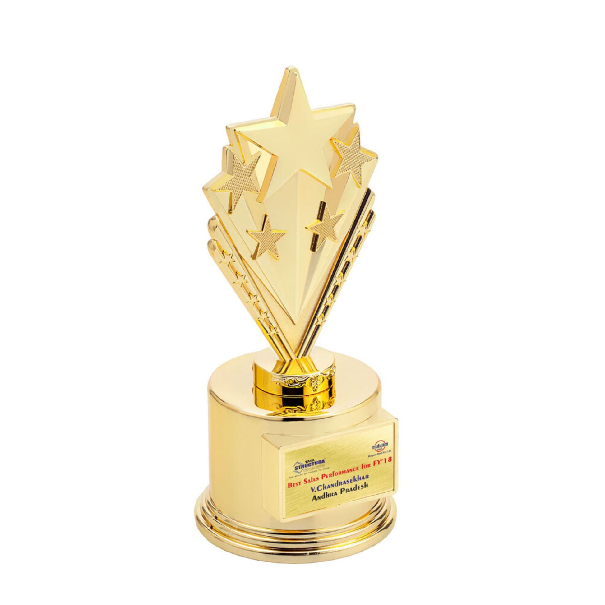 The Sales Champion Star Trophy is a striking recognition award designed to celebrate outstanding sales performance and achievement. Featuring a dynamic burst of textured stars, this trophy embodies the qualities of focus, dedication, and consistent excellence. Crafted with a glossy golden finish, it sits securely on a sturdy metal base that provides stability and presence. The trophy offers ample space for sublimation or multi-colour branding, allowing you to customize it with company logos, names, or achievement details. Ideal for sales excellence awards, regional competitions, and top performer recognition programs, this trophy delivers a professional and memorable way to acknowledge your team's success.