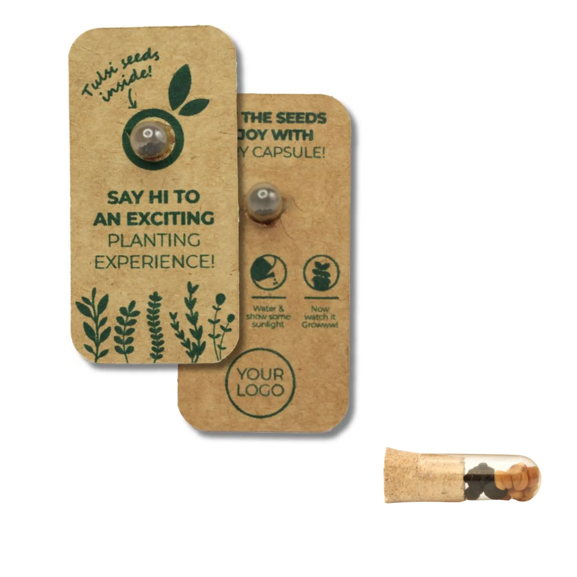 This Seed Capsule In Flap features a cork-capped design that ensures secure seed storage while maintaining natural breathability. Packaged in an eco-friendly recycled paper flap, it offers sustainable protection with minimal environmental impact. Measuring a compact 1.5"x3", this thoughtfully designed capsule is ideal for organized storage and easy handling, making it a practical choice for gardening professionals and enthusiasts alike.